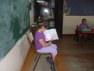 Quase todos os dias os alunos lêem livros para os colegas. São eles que escolhem os livros que quase sempre trazem de casa, lêem para os colegas e professora, uma parte do livro ou o livro completo.